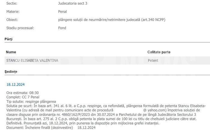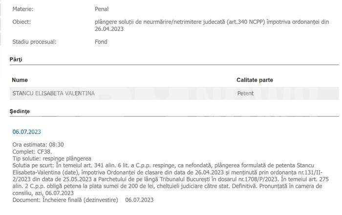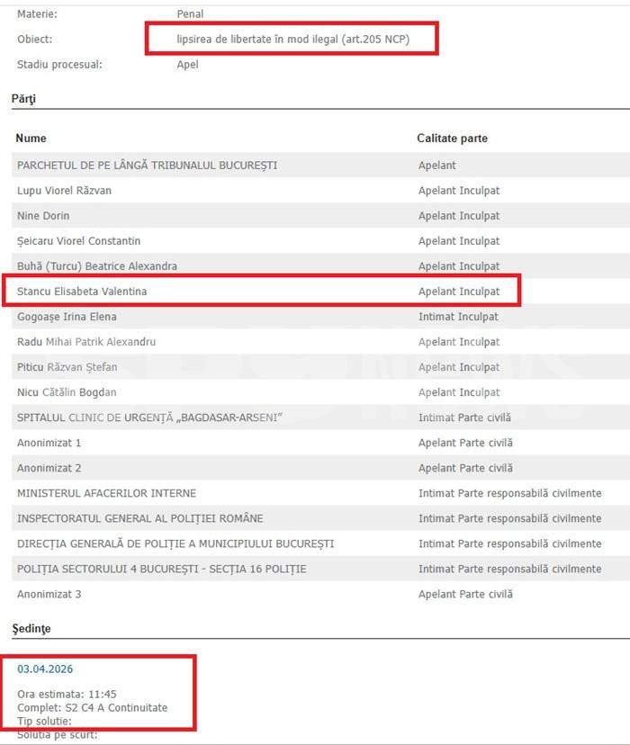 „Stancu Elisabeta Valentina - 6 (șase) ani închisoare. Pedeapsa se execută în regim de detenție”.