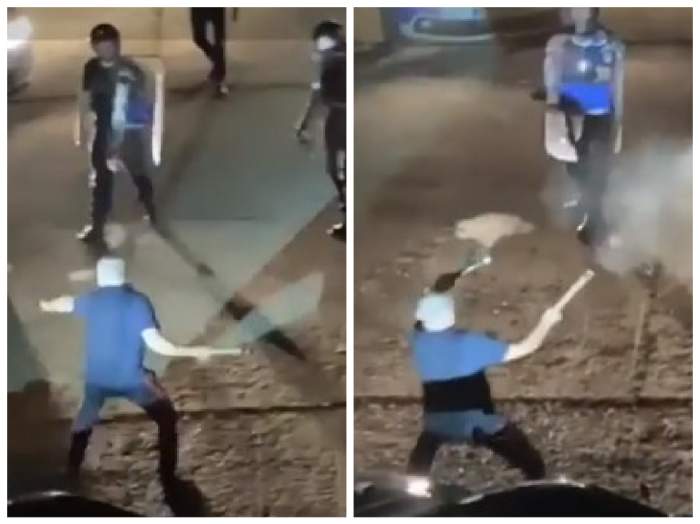 Când au sosit la adresa indicată de femeie, polițiștii l-au găsit pe bărbatul de 47 de ani în faţa blocului. În imagini se observă momentul în care forţele de ordine încearcă să-l convingă pe scandalagiu să se liniștească și să arunce topoarele. Bărbatul refuză şi devine recalcitrant, moment în care poliţiştii sunt nevoiţi să folosească spray-ul lacrimogen pentru a-l imobiliza.