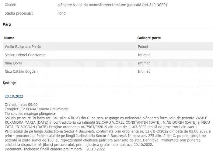 „Respinge ca nefondată plângerea formulată de petenta VASILE RUXANDRA MARIA în contradictoriu cu intimaţii ŞEICARU VIOREL CONSTANTIN, NINE DORIN şi NICU CĂTĂLIN BOGDAN. Menţine ordonanţa nr. 7903/P/2019 din data de 11.03.2022 emisă de procurorul din cadrul Parchetului de pe lângă Judecătoria Sector 4 Bucureşti, confirmată prin ordonanţa nr. 127/II-2/2022 din data de 03.06.2022 a prim - procurorului Parchetului de pe lângă Judecătoria Sector 4 Bucureşti. În baza art. 275 alin. 2 din C. pr. pen. obligă pe petentă la plata sumei de 100 lei, reprezentând cheltuieli judiciare avansate de stat. Definitivă”, a decis, recent, instanța.