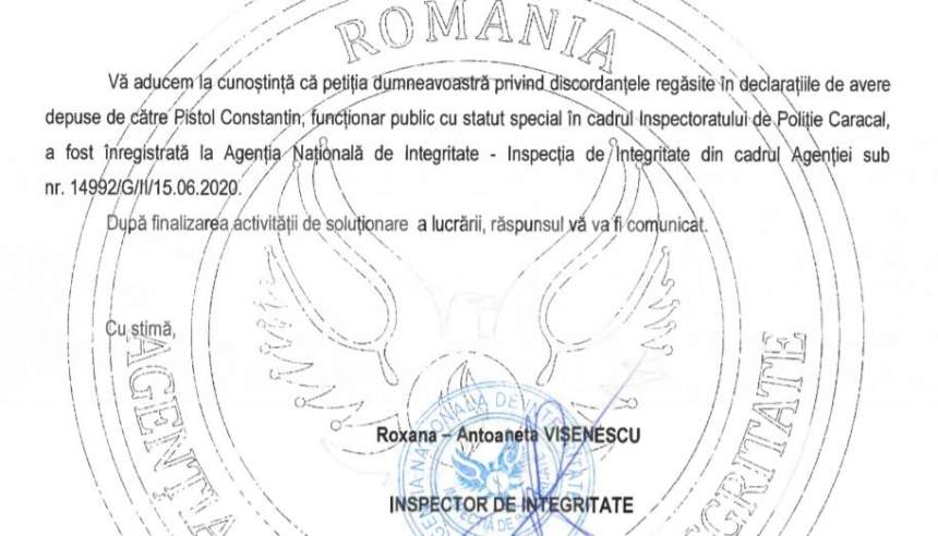 - Agenția Națională de Integritate îl cercetează pe ofițerul Constantin Pistol, pentru fals în declarații