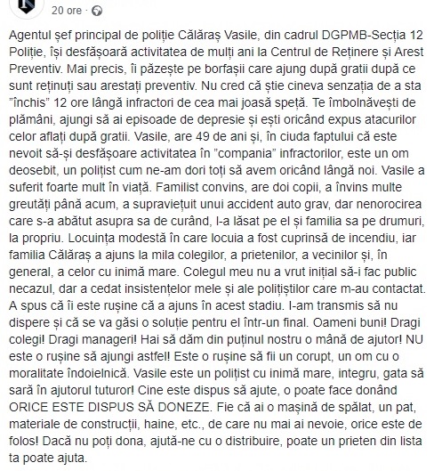 Când viața lui părea să fi reintrat în normal, o nouă nenororcire s-a abătut asupra lui. Un incendiu puternic i-a distrus complet și casa, o locuință modestă pe care acesta și-o ridicase într-o localitate din Ilfov. Rămas sub cerul liber și doar cu hainele de pe el, polițistul a primit sprijin atât din partea colegilor cât și din partea mai multor cetățeni cu inimă mare, care au aflat de incendiu de pe site-urile de socializare și i-au sărit în ajutor.