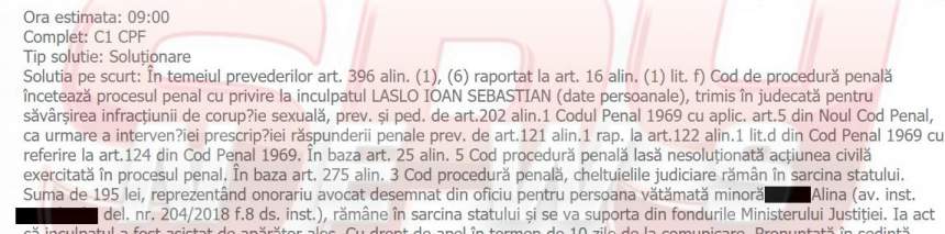 Profesorul Ioan Sebastian Laslo, din Tg. Mureş, protagonist al celui mai mediatizat dosar de pornografie infantilă din ultimii ani, a reuşit să fenteze definitiv puşcăria, chiar datorită judecătorilor. Condamnat definitiv la trei ani cu suspendare, fiindcă şi-a fotografiat elevii în poziţii indecente, Laslo s-a trezit, anul trecut, cu un nou proces, deschis de o altă victimă, "uitată" de procurori şi judecători, din pricina "unei erori". Astfel, fata abuzată de profesor a cerut în instanţă ca autorul să fie pedepsit, iar procesul s-a derulat cu viteza melcului. În luna decembrie a anului trecut, instanţa a hotărât că "ultimul act procedural rămas valabil de la care procesul penal trebuie să îşi reia cursul este încheierea de şedinţă din data de 22 octombrie 2015", faptele imputate datând din 2012. Numai că, recent, cu toate că hotărâseră să reia procesul, judecătorii au realizat că faptele de corupţie sexuală s-au prescris între timp, aşa că l-au achitat pe dascălul pervers. "Încetează procesul penal cu privire la inculpatul LASLO IOAN SEBASTIAN (date persoanale), trimis în judecată pentru săvârşirea infracţiunii de corupţie sexuală, ca urmare a intervenţiei prescripţiei răspunderii penale. Lasă nesoluţionată acţiunea civilă exercitată în procesul penal. Cheltuielile judiciare rămân în sarcina statului", au dispus "reprezentanţii legii".