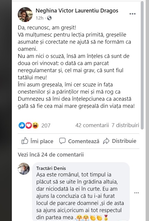 „Da, recunosc, am greșit! Vă mulțumesc pentru lecția primită, greșelile asumate și corectate ne ajută să ne formăm ca oameni. Nu am nici o scuză, însă am înțeles că sunt de două ori vinovat: o dată că am parcat neregulamentar și, cel mai grav, că sunt fiul tatălui meu! Îmi asum greșeala, îmi cer scuze în fața oneștenilor și a părinților mei și mă rog ca Dumnezeu să îmi dea înțelepciunea ca această gafă să fie cea mai mare greșeală din viața mea!”, a scris tânărul, pe pagina sa web.