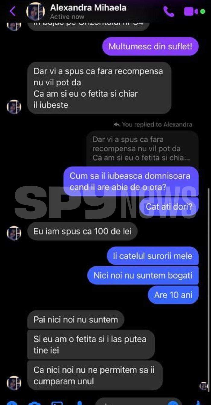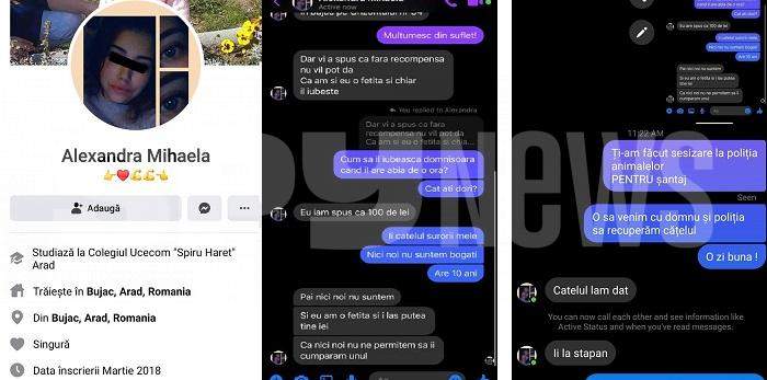 La doar o oră după ce a postat anunțul, tânăra a fost abordată de o individă care a susținut că i-a găsit animalul de companie, dar că este o problemă: în cele 60 de minute, copilul ei s-a atașat foarte mult de cățeluș, așa că vrea să îl păstreze! La insistențele stăpânei, individa a acceptat să-i returneze câinele, însă nu gratis, ci în schimbul sumei de 100 de lei.