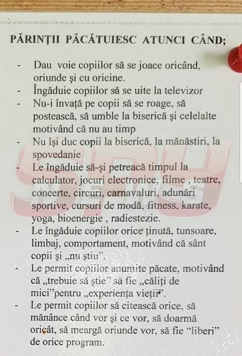 Anunţul care a scos din minţi zeci de oameni a apărut, din senin, pe uşa unei biserici din judeţul Mureş. „Cele opt porunci” ale preotului vin să completeze Decalogul lui Moise, explicând că păcate nu sunt crimele, furturile şi mărturiile mincinoase, ci şi... privitul la televizor, cititul şi practicarea artelor marţiale. Potrivit duhovnicului, „părinţii păcătuiesc atunci când dau voie copiilor să se joace oricând, oriunde şi cu oricine”, „le îngăduie să-şi petreacă timpul la calculator, jocuri electronice, filme, teatre, concerte, circuri, carnavaluri, adunări sportive, cursuri de modă, fitness, karate, yoga” şi „le permit copiilor să citească orice, să mănânce când vor şi ce vor şi să doarmă oricât”. Totuşi, mintea luminată care reprezintă Biserica Ortodoxă Română ar avea şi nişte soluţii pentru spălarea acestor păcate: rugăciunile îndelungi, spovedaniile dese, slujbe intensive şi pelerinaje la mănăstiri.