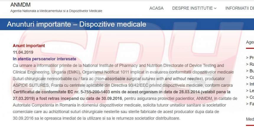 "Ca urmare a informaţiilor primite de la National Institute of Pharmacy and Nutrition Directorate of Device Testing and Clinical Engineering, Ungaria (EMKI), Organismul Notificat 1011 implicat în evaluarea conformităţii dispozitivelor medicale Suturi chirurgicale neresorbabile cu / fără ac, producător ASPIDE SUTURES, Franţa cu cerinţele aplicabile din Directiva 93/42/EEC privind dispozitivele medicale, conform cărora Certificatul de conformitate EC nr. 5-755-200-1403 emis de acest organism în data de 28.03.2014 (valabil până la 27.03.2019) a fost retras începând cu data de 30.09.2016, pentru asigurarea protecţiei pacienţilor, ANMDM, în calitate de Autoritate Competentă în România în domeniul dispozitivelor medicale, solicită tuturor unităţilor sanitare şi societăţilor comerciale care au achiziţionat suturi chirurgicale nesterile sau sterile fabricate de acest producător după data de 30.09.2016 să le oprească imediat de la utilizare şi să le returneze societăţilor distribuitoare", este anunţul făcut de Agenţia Naţională a Medicamentului şi a Dispozitivelor Medicale din România.