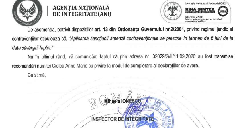 Șefa Biroului de Presă din cadrul Inspectoratului de Poliție (IPJ) Ilfov poate răsufla ușurată: fapta pentru care a fost verificată de Agenția Națională de Integritate (ANI), din cauza soțului, s-a prescris, iar în loc de amendă, a primit niște sfaturi prețioase.