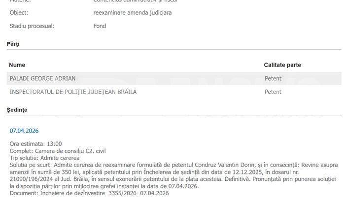 „Admite cererea de reexaminare formulată de petentul Condruz Valentin Dorin, şi în consecinţă: Revine asupra amenzii în sumă de 350 lei, aplicată petentului prin Încheierea de şedinţă din data de 12.12.2025, în dosarul nr. 21090/196/2024 al Jud. Brăila, în sensul exonerării petentului de la plata acesteia. Definitivă. Pronunţată prin punerea soluţiei la dispoziţia părţilor prin mijlocirea grefei instanţei”, a decis, recent, instanța.