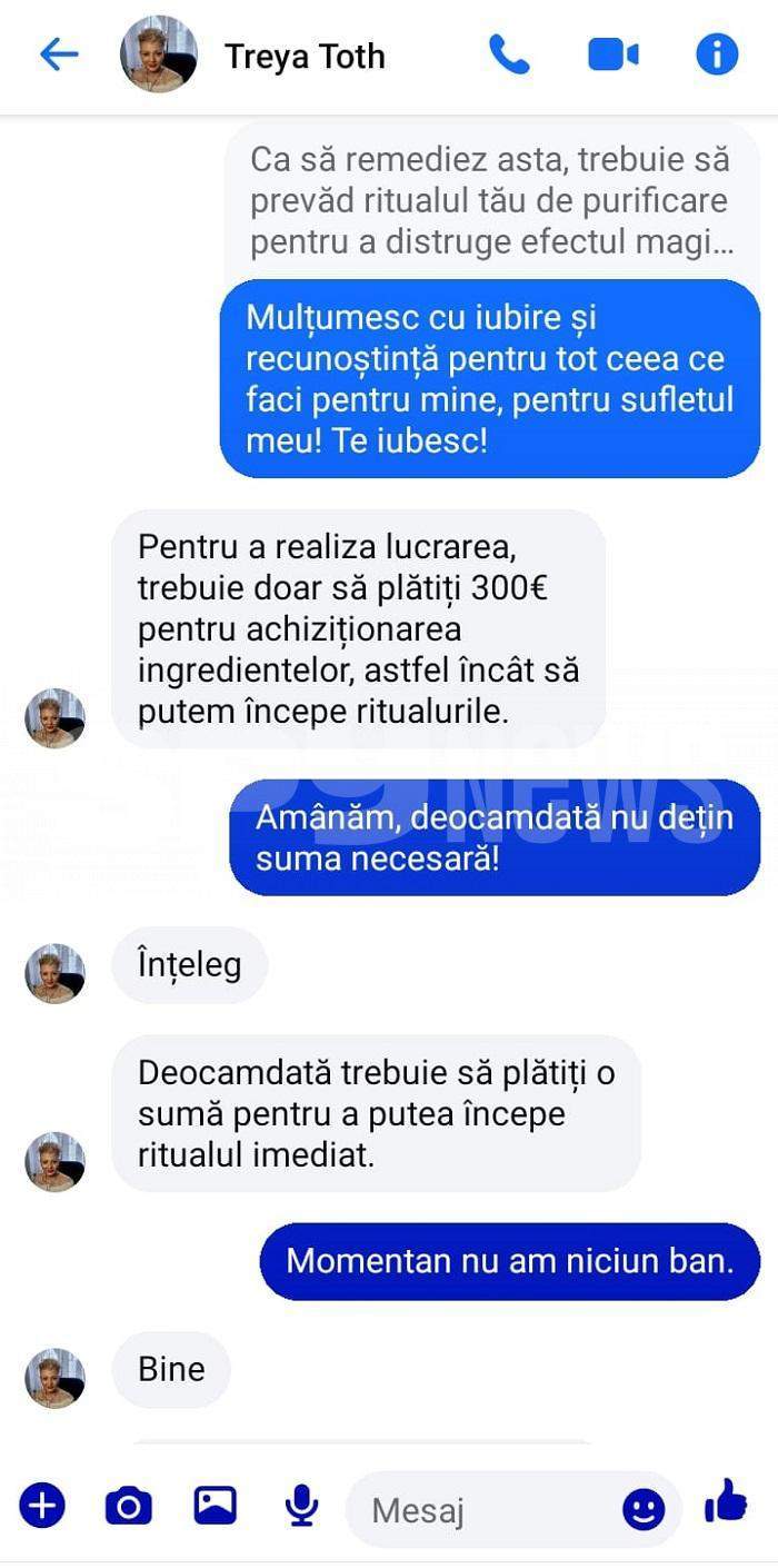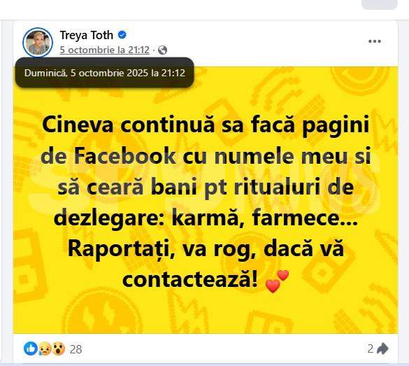 „Pe paginile de socializare online folosesc un pseudonim, Treya Toth, pe care intenționez ca, în viitorul apropiat, să îl trec și în acte. De-a lungul anilor, mi-am creat o relație de încredere cu clienții și urmăritorii mei, motiv pentru care ei țin cont de recomandările mele. Cineva a observat nivelul de încredere al urmăritorii mei în mine și a clonat contul meu folosind imagini de pe pagina profesională și le contactează pe Messenger, pe cele mai active persoane de pe profilul, respectiv pagina mea de Facebook, cerându-le bani pentru a desface nu știu ce magie neagră, prin Ritualuri”, a dezvăluit, în exclusivitate pentru SPYNEWS.ro, Gena Rusu, alias Treya Toth, în luna iulie.
