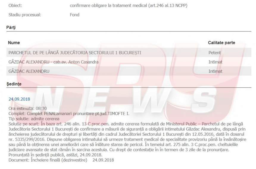 Ieri dimineață, în jurul orei 4.00, Alexandru Găzdac a fost împușcat mortal de un echipaj de poliție care fusese chemat să intervină, întrucât individul atacase un paznic al unui hotel din centrul Capitalei și, iritat de prezența oamenilor legii, l-a tăiat pe unul dintre aceștia. „În această dimineaţă, în jurul orei 04.00, prin apel 112, o persoană dintr-un imobil situat în sectorul 1 a sesizat că un bărbat dezbrăcat, aflat doar în lenjerie intimă, ameninţă pe holuri, având asupra sa mai multe obiecte ascuţite. La faţa locului s-au deplasat poliţişti din cadrul Secţiei 5 Poliţie, care după câteva minute l-au localizat. Din primele date a rezultat că, la vederea poliţiştilor, bărbatul a devenit violent şi a reuşit să îi lovească, ulterior fugind. A fost localizat la un nivel superior, unde a încercat din nou să lovească şi i-a ameninţat, motiv pentru care, după somaţie, unul din poliţişti a executat foc cu armamentul din dotare, rănindu-l”, a explicat Poliţia Capitalei.