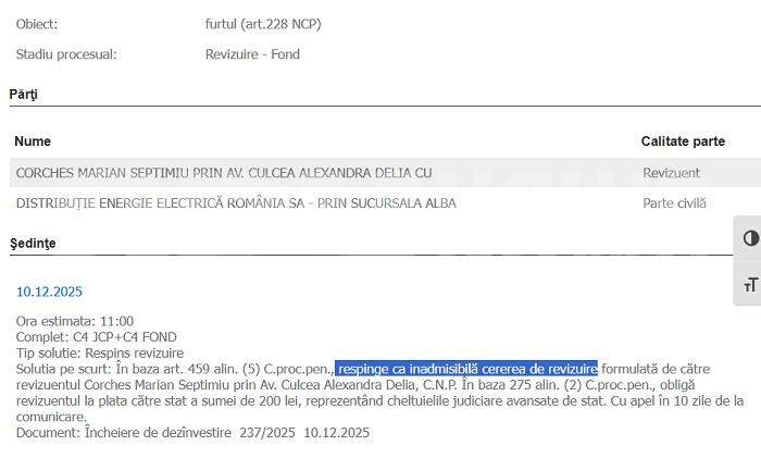 Iar zilele trecute, Judecătoria Câmpeni a decis: „Respinge ca inadmisibilă cererea de revizuire formulată de către revizuentul Corches Marian Septimiu prin Av. Culcea Alexandra Delia, C.N.P. În baza 275 alin. (2) C.proc.pen., obligă revizuentul la plata către stat a sumei de 200 lei, reprezentând cheltuielile judiciare avansate de stat. Cu apel în 10 zile de la comunicare”.