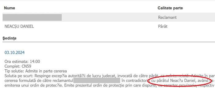 „Admite în parte cererea de chemare în judecată având ca obiect ordin de protecție formulată de reclamantul NEACȘU DANIEL în contradictoriu cu pârâtul .... Emite prezentul ordin de protecţie prin care obligă pârâtul pentru o perioadă de trei luni, începând cu data pronunţării prezentei hotărâri, respectiv până la data de 04.01.2025, inclusiv: - să păstreze o distanţă minimă de 50 de metri faţă de domiciliul reclamantului și al familiei sale situat în ...; - să păstreze o distanţă minimă de 50 de metri faţă de locul de muncă al soției pârâtului, Primăria ....; - să păstreze o distanţă minimă de 50 de metri faţă de locul de joacă al minorului......, situat în... . Interzice pârâtului orice contact, inclusiv telefonic, prin corespondență sau în orice alt mod, cu reclamantul, soția acestuia ..... și minorul ... . Respinge, în rest, cererea ca neîntemeiată. Executorie”, a decis instanța.