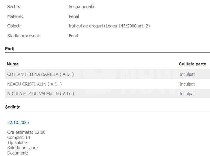 „Constată legalitatea şi temeinicia măsurii arestului la domiciliu a inculpaţilor: COTEANU ELENA-DANIELA, ..., NEAGU CRISTI-ALIN, ..., NICULA MUGUR-VALENTIN, ..., măsură pe care o menţine, urmând a fi verificată până la data de 16.11.2025. Modifică locul unde va executa inculpata COTEANU ELENA-DANIELA, ...măsura arestul la domiciliu, acesta urmând a fi executat în continuare în imobilul situat la adresa ....”, se menționează în hotărârea de prelungire a arestului la domiciliu dată recent de magistrații din Constanța.
