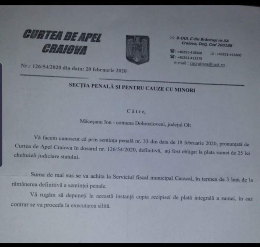 P.S.: Imagine cu hotărârea Curții de Apel Craiova prin care verii mei trebuie să plătească 25 RON fiecare pt că au cerut mutarea judecării lui Dincă‼ În caz contrar, ii execută silit.. No comment!", a explicat Alexandru Cumpănaşu pe reţelele de socializare.