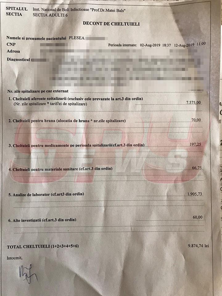 “La Institutul Naţional de Boli Infecţioase Prof.Dr. Matei Bals, cazarea fără mâncare a costat 757,5 RON/zi, adică 160 Euro/zi)!!!