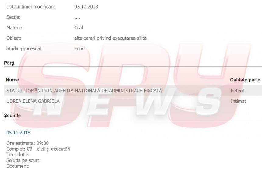 Chiar cu o zi înainte de a fi capturată, infractoarea Elena Udrea era citată, pe site-ul instanţelor de judecată, într-un dosar deschis de ANAF, în care instituţia amintită solicită executarea silită a "blondei de la Cotroceni". "UDREA ELENA GABRIELA, cu ultimul domiciliu în Bucureşti, este chemată în această instanţă, camera 301, în ziua de 05.11.2018, Completul C3 - civil şi executări, ora 09:00, in calitate de Intimată, în proces cu STATUL ROMÂN PRIN AGENŢIA NAŢIONALĂ DE ADMINISTRARE FISCALĂ în calitate de Petent, alte cereri privind executarea silită. În caz de neprezentare a părţilor, judecata se va face în lipsă, dacă se solicită în scris acest lucru de către una din părţi", au anunţat magistraţii. Aşa că, dacă va fi adusă în ţară până luna viitoare, blonda va putea participa la proces, pentru a încerca să îşi apere averea la care pofteşte ANAF.