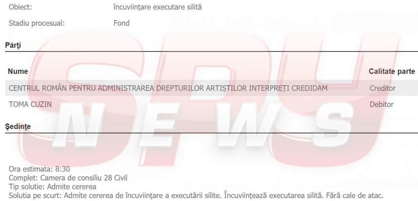 Decizia magistraţilor a fost dată într-un dosar în care CREDIDAM solicitase executarea silită a actorului. Astfel, după ce au analizat documentele depuse la dosar, judecătorii au dispus: „Admite cererea de încuviinţare a executării silite. Încuviinţează executarea silită. Fără cale de atac”.