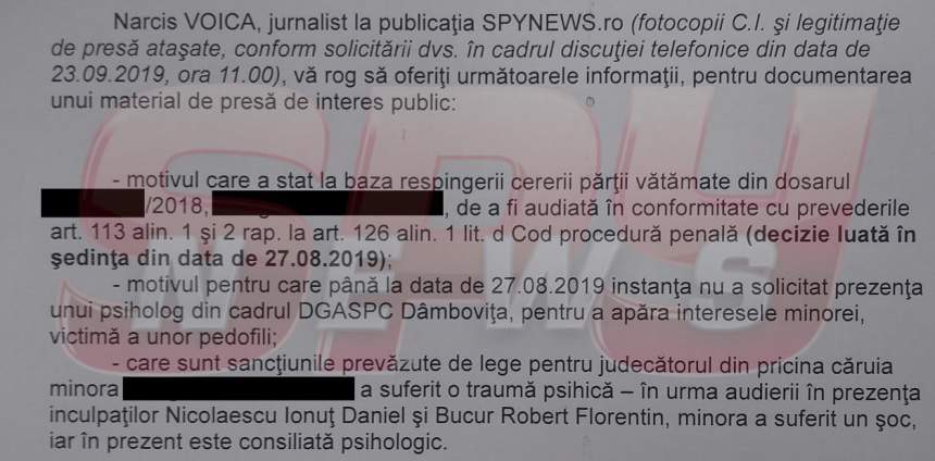 Ieri, reporterii SPYNEWS au solicitat un punct de vedere conducerii Tribunalului Dâmboviţa, cu privire la acuzaţiile grave, însă, până la închiderea ediţiei, magistraţii nu au răspuns de ce minorei i s-a respins cererea de a fi protejată, în condiţiile legii, şi a fost obligată de judecător să retrăiască momentele cumplite, ajungând, acum, să se trateze la psiholog.