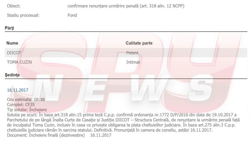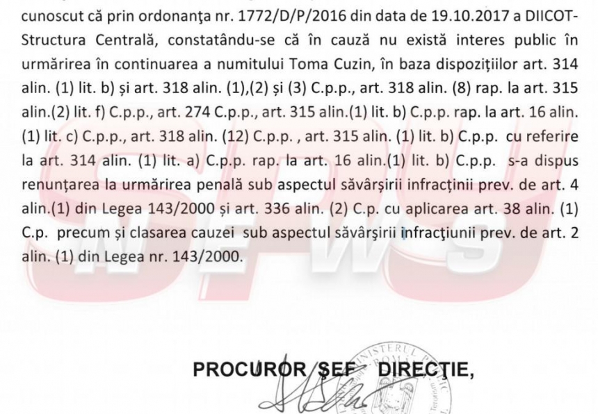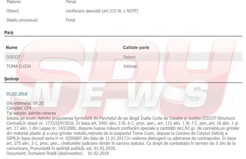 Dosarul respectiv s-a închis, însă, definitiv, abia în noiembrie 2017, când judecătorii au acceptat propunerea procurorilor. Adică la o lună după ce Jandarmeria l-a ales pe "Firicel" imagine a instituţiei. Apoi, anul acesta, DIICOT a deschis un nu dosar, pentru confiscarea drogurilor ridicate de la actor. "Admite propunerea formulată de Parchetul de pe lângă Înalta Curte de Casaţie şi Justiţie-DIICOT-Structura Centrală,în dosar nr. 1772/D/P/2016. În baza art. 5491 alin. 3 lit. b C. proc. pen., art. 112 alin. 1 lit. f C. pen.,art. 16 alin. 1 şi art. 17 alin. 1 din Legea nr. 143/2000, dispune luarea măsurii confiscării speciale a cantităţii de1,92 gr. de cannabis,un grinder din material plastic şi a unui grinder metalic, reţinute de la suspectul Toma Cuzin, depuse la Camera de Corpuri Delicte a IGPR,în baza dovezii seria H nr. 0205687 din data de 11.01.2017,în vederea distrugerii cu păstrarea de contraprobe", au dispus judecătorii pe 1 februarie 2018. Adică la câteva luni după ce Jandarmeria a început să îşi facă reclamă prin "Firicel".