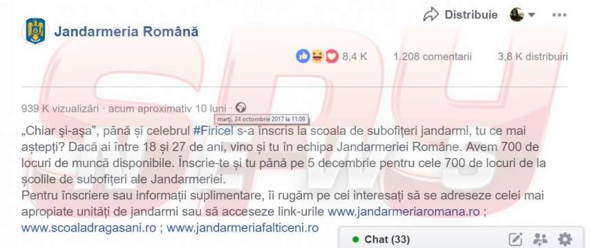 Într-o încercare disperată de a recruta forţă de muncă, Jandarmeria Română a apelat la sprijinul unui actor celebru, Cuzin Toma, alias "Firicel" din "Las Fierbinţi", în vederea realizării unui spot publicitar. Aşa că, în octombrie 2017, la ora 11.09, pe pagina oficială de Facebook, Jandarmeria Română a postat un clip menit să atragă cât mai mulţi candidaţi la şcolile de subofiţeri, avându-l ca protabgonist pe "Firicel": "«Chiar şi-aşa», până și celebrul #Firicel s-a înscris la scoala de subofițeri jandarmi, tu ce mai aștepți? Dacă ai între 18 și 27 de ani, vino și tu în echipa Jandarmeriei Române. Avem 700 de locuri de muncă disponibile. Înscrie-te și tu până pe 5 decembrie pentru cele 700 de locuri de la școlile de subofițeri ale Jandarmeriei".