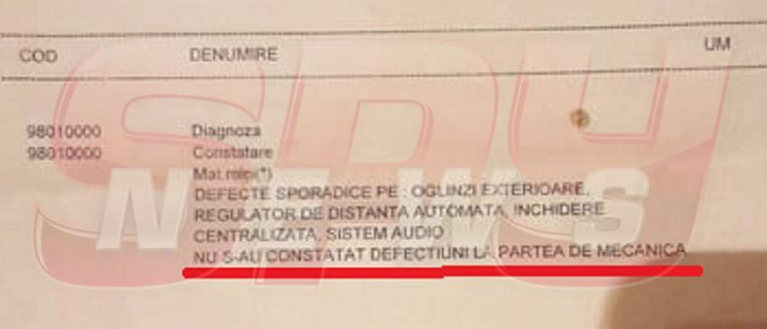 Diana M. (foto sus) a dezvăluit, în exclusivitate pentru SPYNEWS, că întregul coşmar a început în 2017 şi a culminat cu două atentate în stil mafiot, comise în august 2018 şi în ianuarie a.c. "Am cumpărat o maşină de la un individ care deţine o firmă care vinde maşini SH. Am dat 25.000 de euro pe maşină, iar după câteva săptămâni am constatat că avea defecţiuni severe, care costau peste 11.000 de euro. Înainte de a cumpăra maşina, am mers la un service, pentru a constata eventualele probleme. Am mers la Focşani, iar vânzătorul a plătit expertiza. Nu au fost constatate defecţiuni tehnice (facsimil jos). După câteva săptămâni – timp în care nu am folosit-o, fiindcă nu aveam anvelope de iarnă -, maşina s-a stricat. Am dus-o la reprezentanţă şi mi-au spus că mă costă cutia de viteze 10.000 de euro, iar pernele de aer de pe spate care erau sparte, peste 1.000 de euro. Ulterior aveam să aflu că cel care a făcut constatarea la Focşani, prima dată, era mână în mână cu vânzătorul... Cu documentele de la reprezentanţă ce atestau faptul că maşina era defectă, am mers la vânzător şi i-am zis că vreau să îi returnez autoturismul, întrucât m-a păcălit că nu avea probleme. Din acel moment, respectivul a început să mă ameninţe cu moartea, aşa că am depus împotriva lui o plângere penală", a declarat femeia, în exclusivitate pentru SPYNEWS.