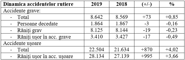 Situația privind dinamica accidentelor rutiere în anul 2019 comparativ cu anul 2018
