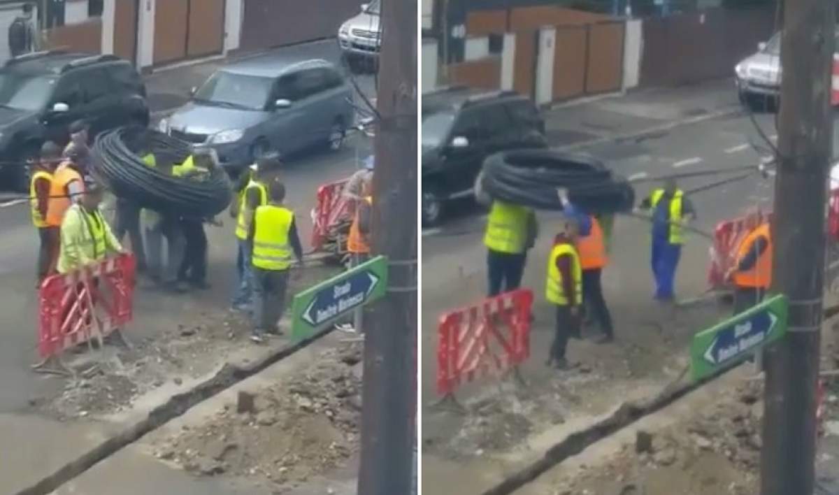 Mai mulţi muncitori au fos filmaţi în timp ce se chinuiau cu o rolă de furtun, cel mai probabil pentru apă. N-a fost foarte greu! Imediat şi-au dat seama că unde-s mai mulţi puterea creşte, astfel că s-au adunat şi au ridicat rola.