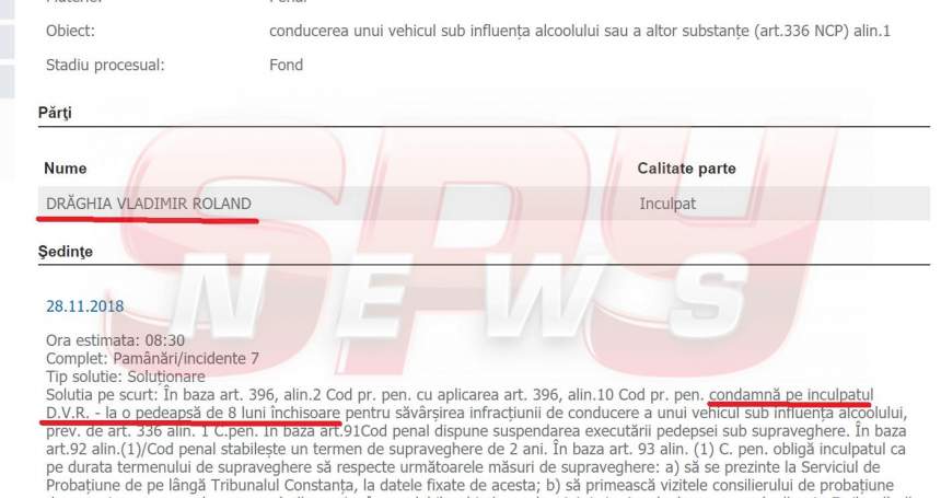 La finele lunii trecute, magistraţii de la Judecătoria Constanţa au dispus: "Condamnă pe inculpatul Drăghia Vladimir Roland la o pedeapsă de 8 luni închisoare pentru săvârşirea infracţiunii de conducere a unui vehicul sub influenţa alcoolului. Dispune suspendarea executării pedepsei sub supraveghere. Stabileşte un termen de supraveghere de 2 ani".