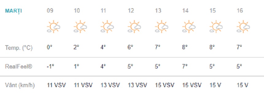 Vremea de marți anunță temperaturi cuprinse între 6 și 8 grade, cu soare și mai puțin vânt decât în zilele trecute.