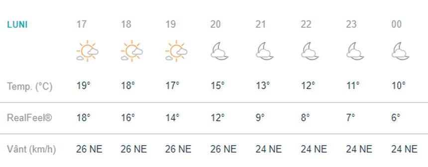Cele mai scăzute temperaturi vor fi dimineaţă, la ora 09.00, atunci când termometrele vor indica 10 grade. Ulterior, mercurul începe să se ridice în termometre, iar bucureştenii se vor bucura de cele mai multe grade la ora 14.00, când vor fi 20 de grade. Pe timpul nopţii gradele vor scădea până la 10.