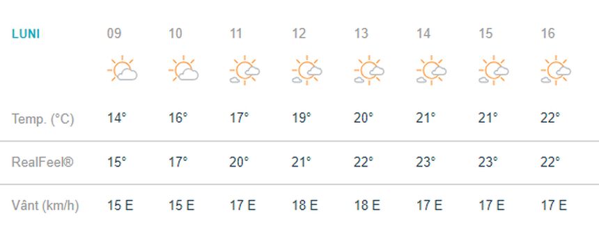 Astfel, luni, 13 mai, cel mai răcoare ar urma să fie dimineaţa, la ora 09.00, atunci când se anunţă 14 grade. Mercurul urmează să urce apoi în termometre, iar la orele prânzului, la 12.00, se va ajunge la 19 grade. Cel mai cald va fi la ora 17.00, când se anunţă 22 de grade.