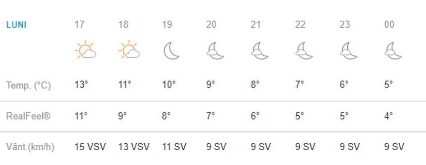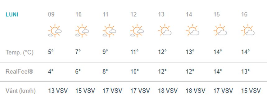 Chiar dacă la primele ore ale dimineţii nu se va trece de cinci grade, soarele îşi face apariţia, iar la ora 16.00 bucureştenii se vor bucura de 14 grade. Pe timpul nopţii, mercurul din termometre va scădea, din nou, până la cinci grade.