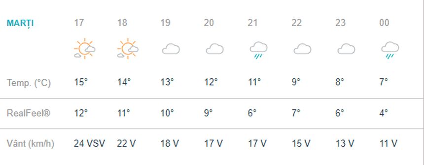 Cele mai puţine grade vor fi dimineaţa, la ora 09.00, atunci când sunt indicate 9 grade. Temperatura urmează să crească pe parcurs, iar la ora 14.00 se va ajunge la maxima de 17 grade. Pe timpul nopţii, termometrele vor scădea până la 7 grade, iar la miezul nopţii sunt condiţii de ploaie.