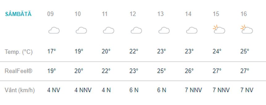 Sâmbătă, 18 mai, se anunţă nori în prima parte a zilei, iar dimineaţa, la ora 09.00, vor fi 17 grade. Cel mai cald va fi la ora 16.00, atunci când se va ajunge la 25 de grade.