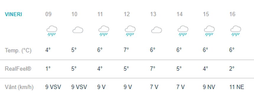 La ora 09.00, vineri, 22 februarie, vor fi condiţii de ploaie, astfel că bucureştenii nu trebuie să plece la drum fără umbrelă. La ora 10.00 ploaia încetează, asta pentru ca peste o oră să înceapă din nou. La ora 21.00 termometrele vor ajunge la minus un grad, iar la miezul nopţii vor scădea la minus trei.