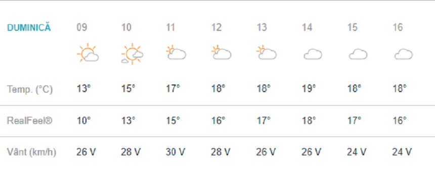 După ora 11, temperaturile încep să crească, iar maxima zilei de 19 grade se va înregistra în jurul orei 14. După ora 14, temperaturile încep să scadă, iar la ora 18, în termometre se vor înregistra 16 grade.