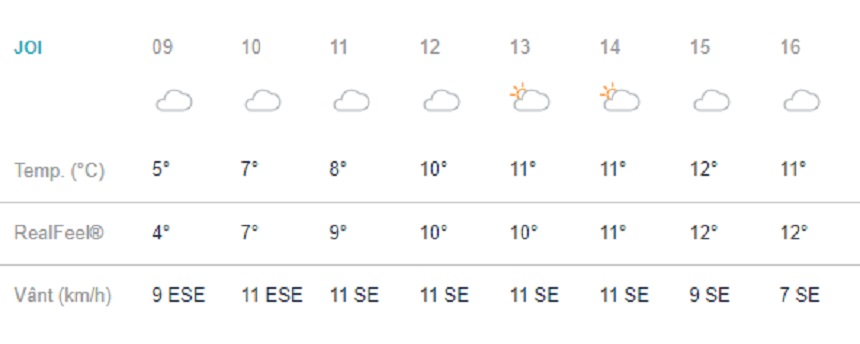 În intervalul orar 12-15, gradele vor crește, iar temperaturile vor fi extrem de plăcute. Norii se vor risipi, iar bucureștenii se vor putea bucura de o zi de primăvară ca la carte. La ora 12 se vor înregistra, în București, 10 grade, la ora 13:00 vor fi 11 grade în termometre, la ora 14:00 vor fi 11 grade în București, iar la ora 15:00 se va înregistra maxima zilei de 12 grade Celsius.