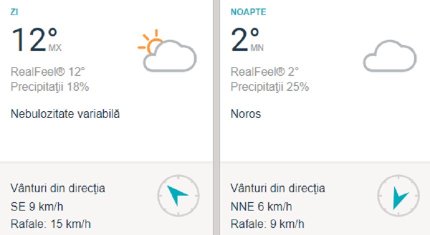 Începând cu ora 16, temperaturile vor începe să scadă treptat, iar minima zilei se va înregistrra spre orele nopții. Aceasta va fi de 2 grad Celsius.