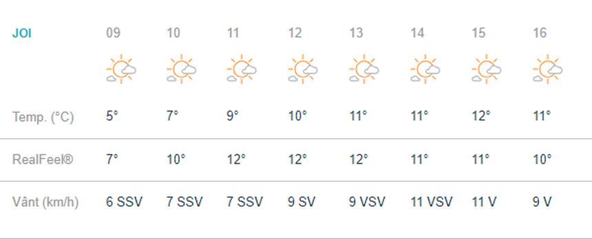 La ora 9 dimineaţa vor fi 5 grade, urmând ca în orele următoare gradele să crească cu câte două grade. Cele mai multe grade în termometre se vor simţi joi, în Bucureşti, la ora 15.00, atunci când vor fi 12, urmând ca de la ora 16.00, acestea să înceapă să scadă.