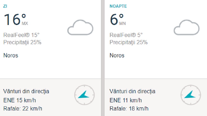 În intervalul orar 13:00 - 15:00, temperaturile vor crește ușor și maxima zilei se va înregistra la ora 15:00. Atunci, termometrele vor indica 16 grade Celsius.