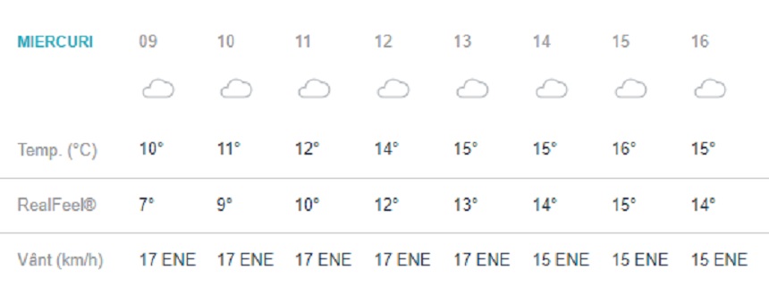 Dimineața de miercuri îi găsește pe bucureșteni cu 10 grade în termometre, urmând ca odată cu trecerea orelor, temperaturile să crească. La ora 9:00 vor fi 10 grade, la ora 10:00 temperaturile vor crește și vor ajunge la 11 grade, iar la ora 11 se vor înregistra 12 grade în termometre.