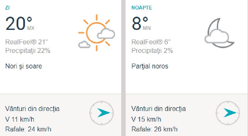 După ora 16, temperaturile încep să scadă treptat. Astfel, la ora 17:00 se vor înregistra 18 grade, iar până la ora 22:00, temperaturile vor ajunge la 12 grade Celsius. Noaptea, în termometre se vor înregistra 8 grade, iar aceasta va fi temperatura minimă a zilei.