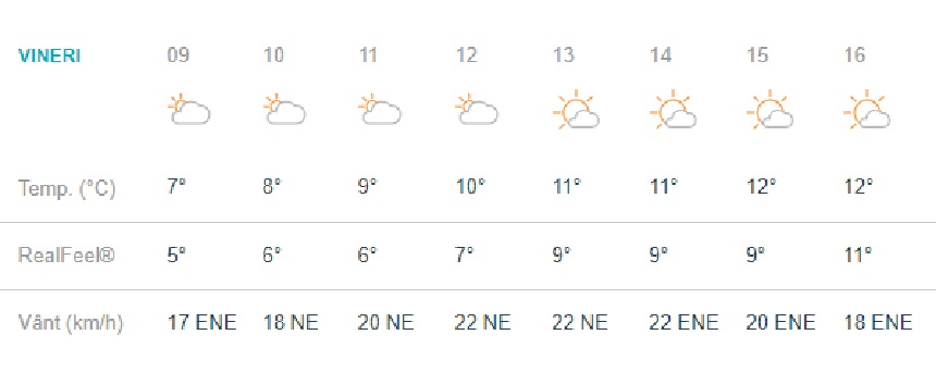 De la ora 16:00, temperaturile încep să scadă ușor. La orele 16:00 se vor înregistra 12 grade Celsius și la 17:00 vor fi 11 grade Celsius. La ora 19:00 se vor înregistra 9 grade Celsius.