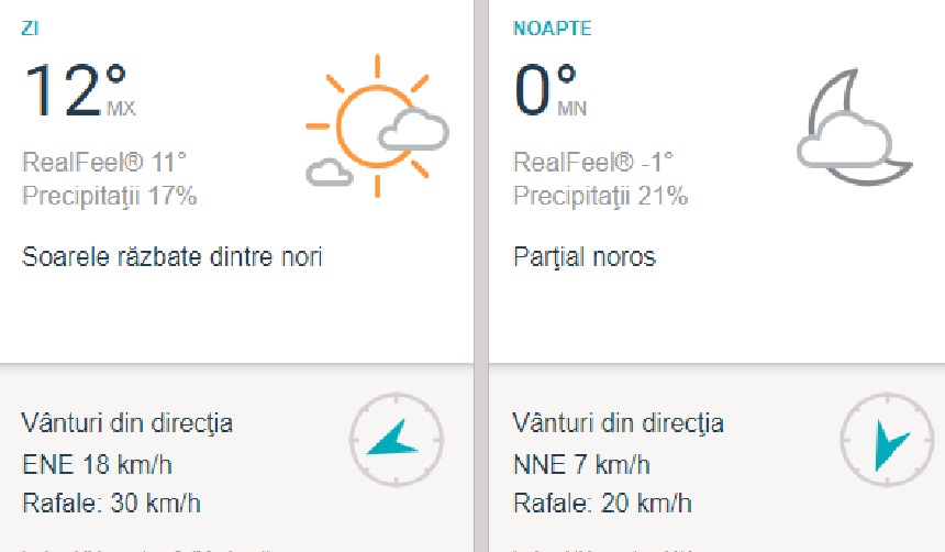 În intervalul orar 13:00 - 15:00, temperaturile vor crește ușor și maxima zilei se va înregistra la ora 15:00. Atunci, termometrele vor indica 12 grade Celsius.