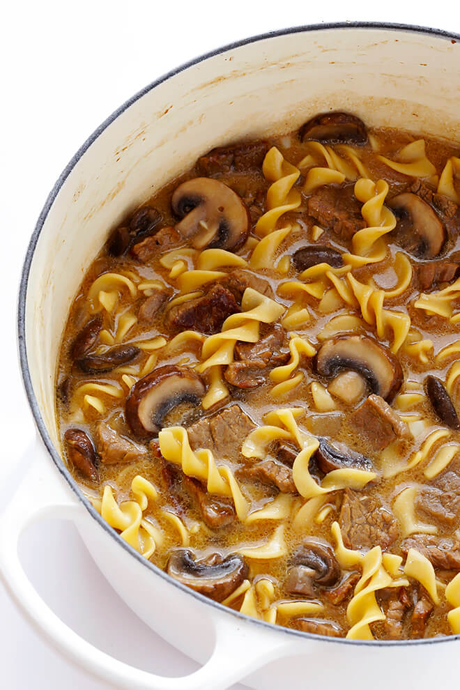 Într-o oală mare, la foc mediu, se topesc două linguri de unt. Apoi se adaugă cubulețele de carne de vită, sare și piper. Se călește timp de aproximativ șapte minte, amestecând ocazional. După ce carnea s-a rumenit, se transferă pe un platou și se lasă deoparte. În oală, se adaugă untul rămas, ciupercile, ceapa și usturoiul. Se călesc timp de aproximativ șase minute până când ceapa se înmoaie și ciupercile se rumenesc. Apoi se adaugă vinul, se amestecă și se lasă să fiarbă timp de trei minute până ce lichidul scade pe jumătate. Se adaugă cinci căni din cantitatea de supă și pastele. Se amestecă până ce toate ingredientele se combină perfect și se lasă să fiarbă timp de opt minute. După ce pastele au fiert, se adaugă smântâna și făina, amestecând constant. Se lasă supa să fiarbă aproximativ cinci minute, apoi se adaugă bucățile de carne și se asezonează cu sare și piper. Se pune supa în boluri de servire, se garnisește cu pătrunjel proaspăt și se servește imediat.