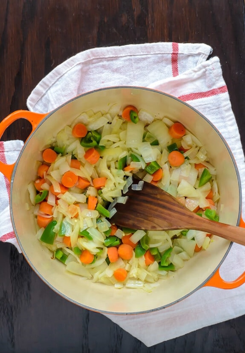 Într-o oală mare, la foc mediu, se topeşte unutul. Apoi se adaugă ceapa, morcovii şi ardeiul iute. Se călesc timp de aproximativ cinci minute până ce legumele se înmoaie. Apoi se adaugă usturoiul, sarea, piperul şi se presară deasupra făina. Se găteşte timp de aproximativ un minut. Se adaugă, treptat, laptele şi se lasă să fiarbă timp de aproximativ trei minute, amestecând constant. Se adaugă supa de pui şi cubuleţele de cartofi şi se lasă să fiarbă timp de aproximativ o oră, cu capacul pus.