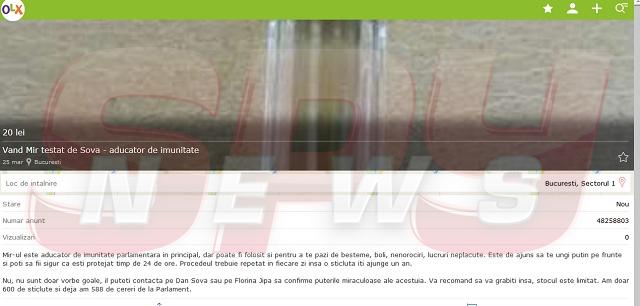 "Vând Mir testat de Şova -aducător de imunitate. Mir-ul este aducător de imunitate parlamentară în principal, dar poate fi folosit şi pentru a te păzi de besteme, boli, nenorociri, lucruri neplăcute. Este de ajuns să te ungi puţin pe frunte şi poţi să fii sigur că eşti protejat timp de 24 de ore. Procedeul trebuie repetat în fiecare zi însă o sticluţă îţi ajunge un an. Nu, nu sunt doar vorbe goale, îl puteţi contacta pe Dan Şova sau pe Florina Jipa să confirme puterile miraculoase ale acestuia. Vă recomand să vă grabiţi însă, stocul este limitat. Am doar 600 de sticluţe şi deja am 588 de cereri de la Parlament", este anunţul inedit dat de un bucureştean.