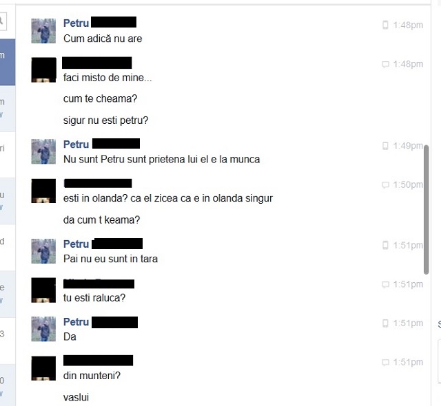 Raluca M. a călcat grav pe bec după ce SPYNEWS a dezvăluit că logodnicul ei, Petru, aflat la muncă în străinătate, flirtează în spaţiul virtual cu alte femei. În încercarea disperată de a afla ce discută viitorul soţ cu altele, Raluca a accesat ilegal contul de Facebook al bărbatului şi le-a luat la rost pe prietenele virtuale ale acestuia. "De când vă cunoaşteţi? Ce ţi-a propus? De ce discuţi cu el, dacă ştii că are iubită?" - sunt doar câteva dintre întrebările la care Raluca spera să primească răspunsuri. În momentul în care interlocutoarea Ralucăi i-a explicat acesteia că logodnicul ei a susţinut că este burlac şi că i-a propus să se întâlnească, tânăra a luat foc: "Vreau să îmi dai toate conversaţiile voastre! Te rog, vreau să le văd, pentru că el le-a şters şi eu nu le pot vedea..."