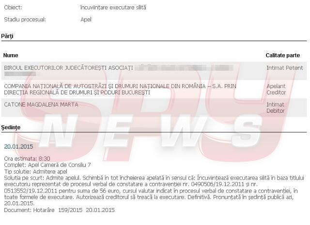 Soluţia instanţei vine după ce, în luna septembrie a anului trecut, Judecătoria Sectorului 2 a hotărât, de două ori într-o lună, executarea actriţei Magda Catone în procese deschise pe numele ei de CNADNR pentru neachitarea banalei taxe de drum.