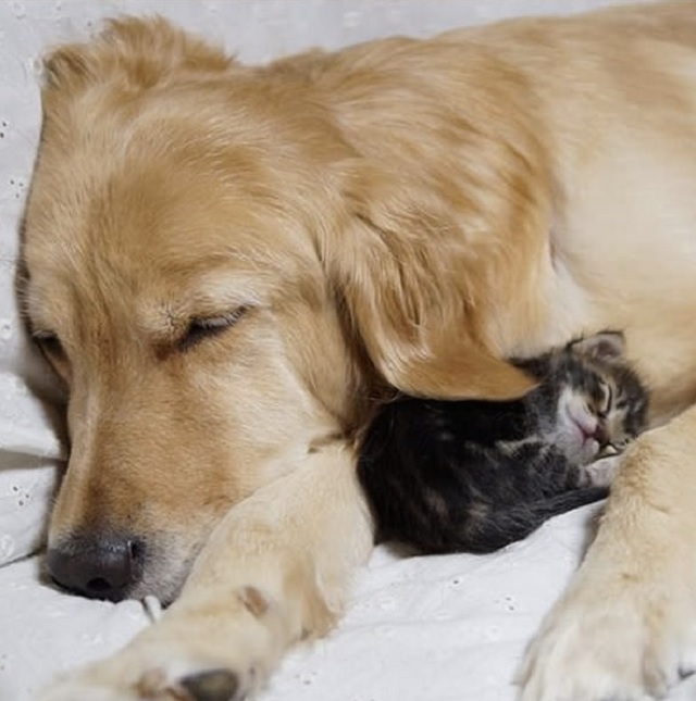 Războiul etern dintre câini şi pisici are şi mici excepţii. Un căţel de rasă a salvat de la moarte un pui de pisică şi chiar l-a lăsat să doarmă pe blana lui.